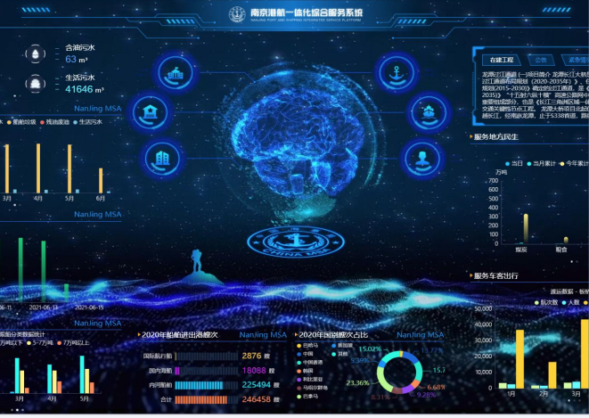 实时展示南京港全境内的通航状态,相关数据;可以实时查询港内任意船舶信息,船员信息,诚信信息等;可以实时展示海事的局情信息等。